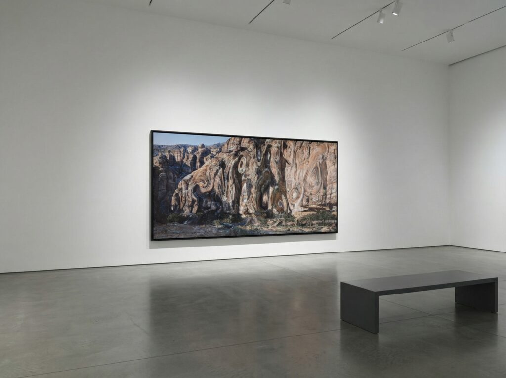 Les archives contrefactuelles sont élaborées à partir d’un corpus photographique authentique découvert in situ. Ces images, manipulées et réinterprétées par l’IA, créent une nouvelle strate narrative, brouillant les frontières entre le passé réel et un passé imaginé. Parallèlement, des photographies générées artificiellement présentent des œuvres d’art fictives, intégrées dans le paysage désertique environnant. Cette juxtaposition entre le naturel et l’artificiel soulève des questions sur la nature de l’art, son contexte, et sa perception.