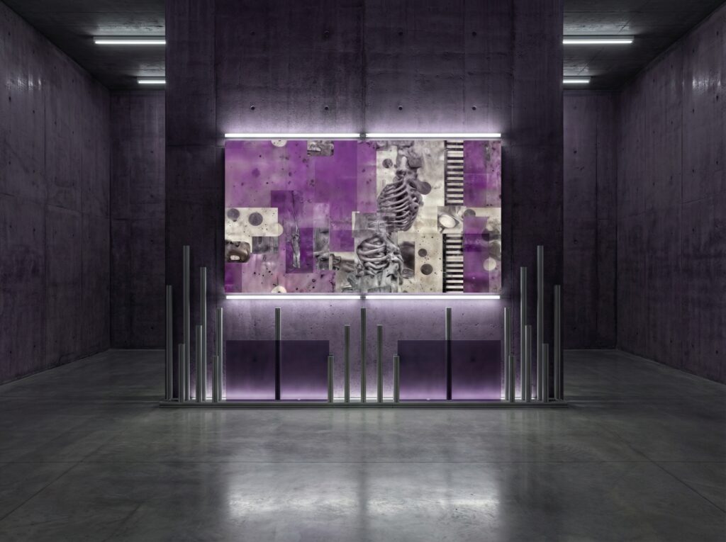 This series of AI-generated images explores the porous boundaries between Brutalist architecture, the materiality of concrete, and the organicity of the human body. Against a signature violet background, abstract compositions emerge where architectural structures and biological forms fuse into a hybrid assemblage.