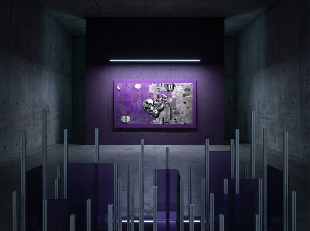 Cette série d’images générées par intelligence artificielle explore les frontières poreuses entre architecture brutaliste, matérialité du béton et organicité du corps humain. Sur un fond violet caractéristique, des compositions abstraites émergent où structures architecturales et formes biologiques fusionnent dans un assemblage hybride.