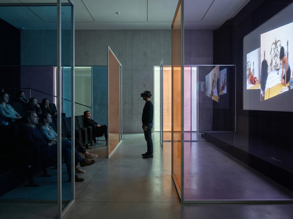 Une reconstruction d’une scène du Mépris dans un espace 3d. La navigation spatiale prend la place du montage temporel.