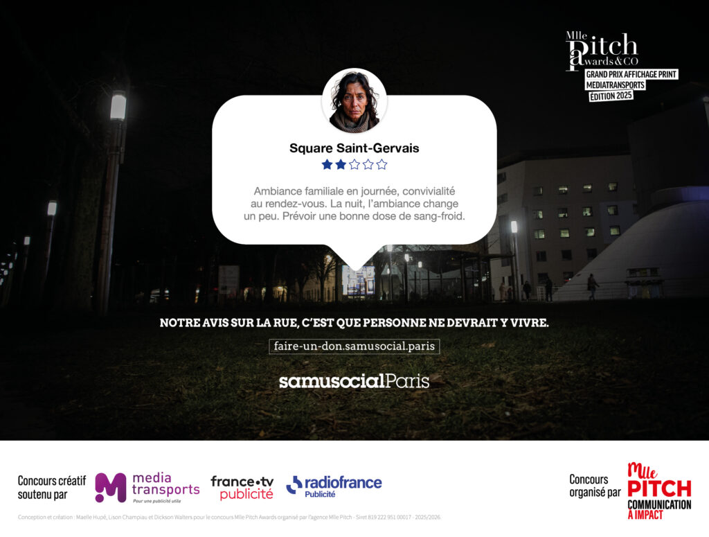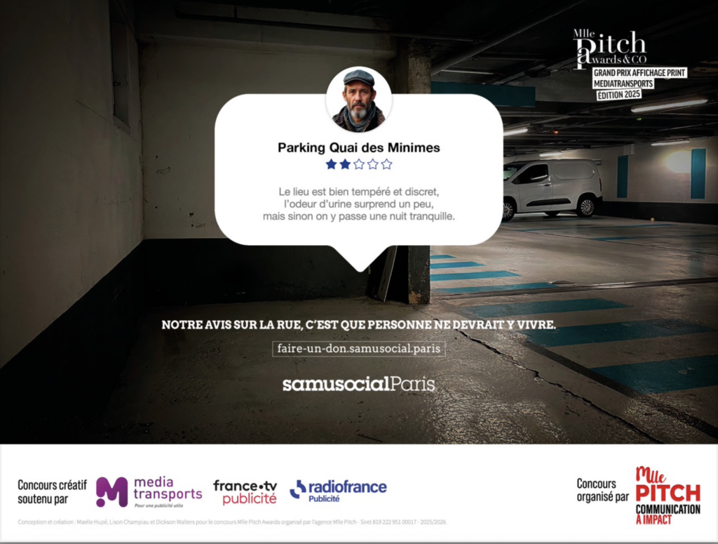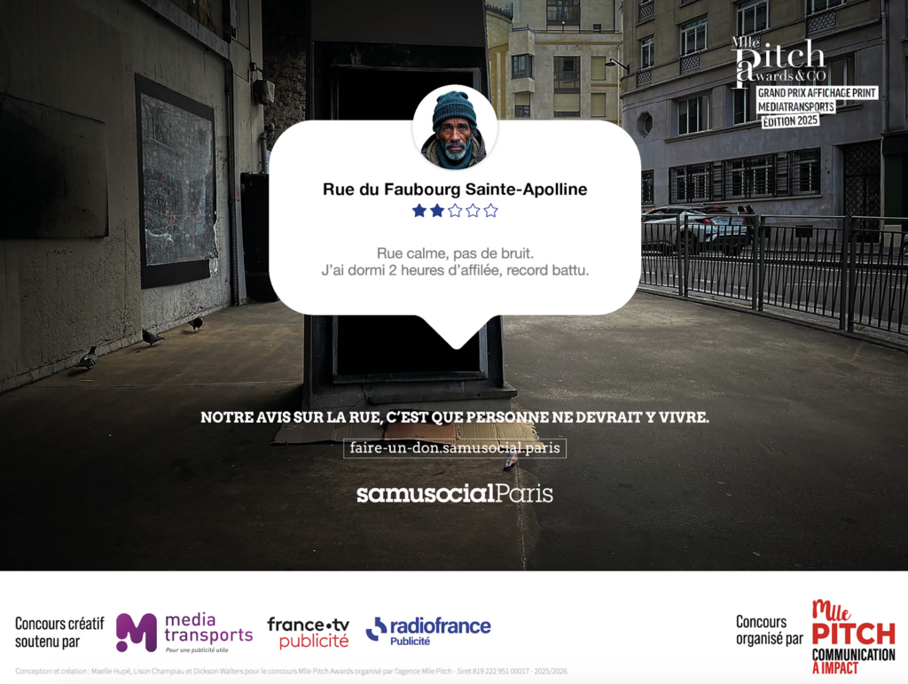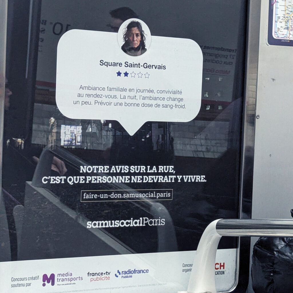 The latest campaign by Samu Social de Paris, deployed in the Parisian metro under the title “Street Opinion,” proposes an apparently simple narrative: homeless people evaluate their precarious living spaces according to the codes of online review platforms. We see a profile picture, a star rating (generally low), and a comment oscillating between the dramatic and the humorous. “Guaranteed drafts,” “Unobstructed view of concrete,” “Icy welcome.” The intention seems laudable: create an effect of recognition, bring these marginalized existences into a framework familiar to urban audiences, trigger empathetic insight through ironic subversion.