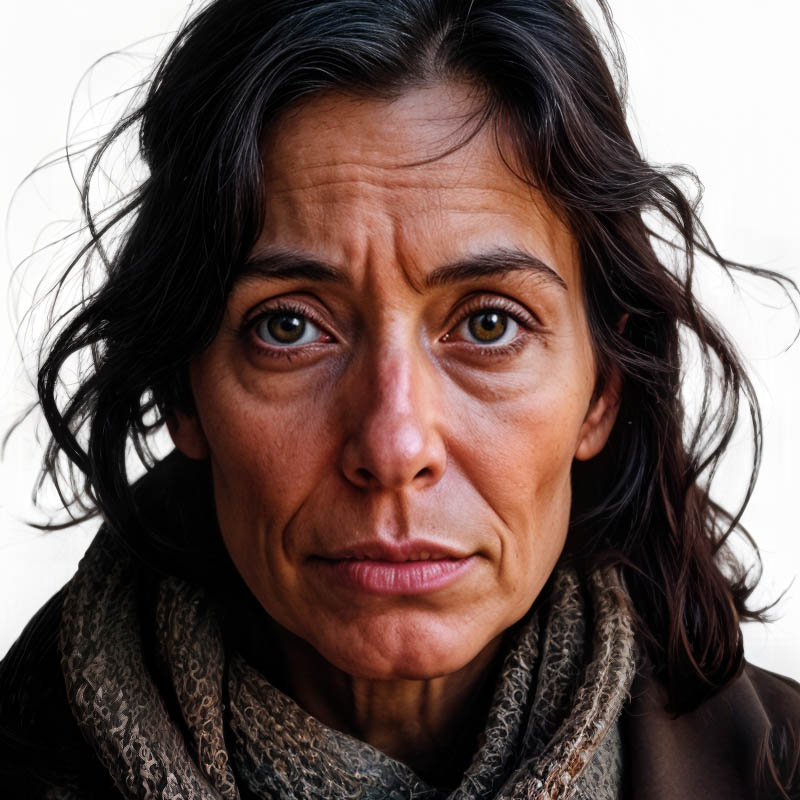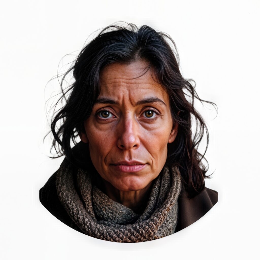 On aimerait avoir accès aux prompts exacts utilisés par l’agence de communication. Comment formule-t-on cette demande à Midjourney ? Par reverse prompting, on peut reconstituer des formulations de ce type : « Portrait photographique réaliste d’une femme d’âge mûr aux cheveux noirs ondulés mi-longs, peau mate légèrement ridée, regard intense et mélancolique tourné vers la caméra, portant une écharpe tricotée grise autour du cou, fond blanc neutre, éclairage naturel doux, style documentaire social, photographie humaniste, haute qualité, détails réalistes du visage. »