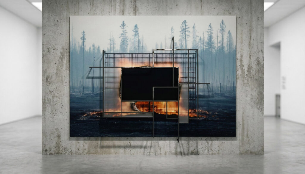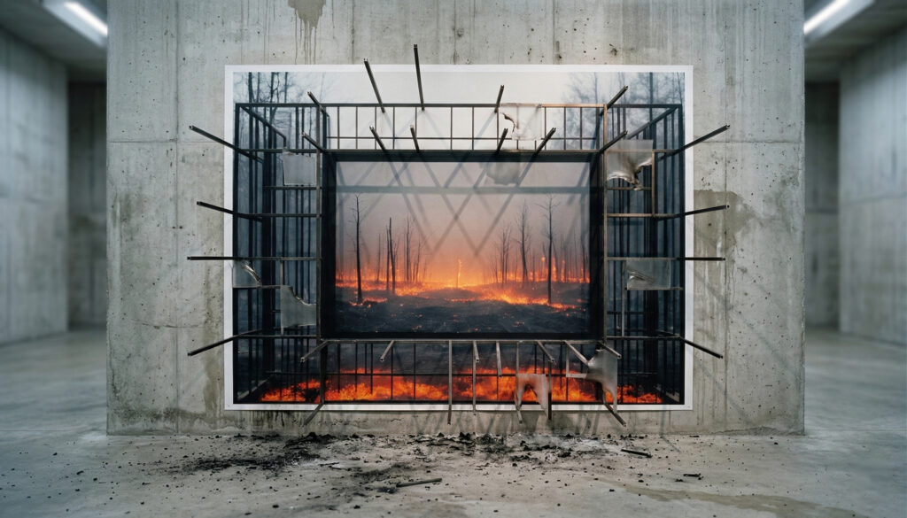 Ce travail s’inscrit dans l’exploration par Chatonsky des thèmes de l’effondrement technologique et de l’extinction. En représentant ces datacenters carbonisés, l’artiste interroge la fragilité de notre mémoire numérique collective et la vulnérabilité des systèmes sur lesquels repose notre civilisation contemporaine.