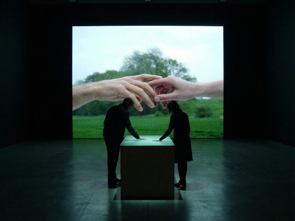 Cette installation interactive propose une expérience tactile médiatisée par l’interface numérique. Le dispositif comprend une surface vitrée équipée de capteurs qui détectent les mouvements de la main du visiteur, permettant de manipuler à distance les images vidéo de deux mains, l’une masculine et l’autre féminine.