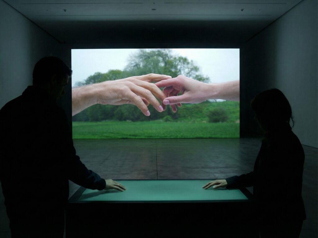 This interactive installation offers a tactile experience mediated by a digital interface. The device consists of a glass surface equipped with sensors that detect the movements of the visitor’s hand, allowing them to remotely manipulate video images of two hands—one male and one female.