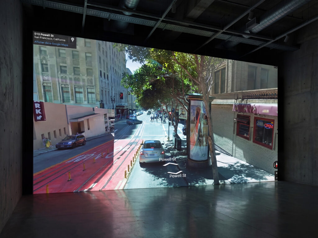 In Vertigo (1958), a man in a car follows a woman who is looking for an inexistant past. Using Google Streetview, the artist found back the filming sites of the movie. He was thus able to reproduce with precision the caracters course in San Francisco. He filmed Vertigo for a second time but stayed home to do it.
